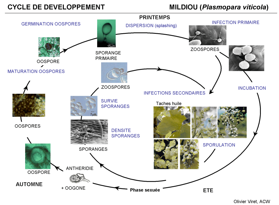 Oomycète originaire d’Amérique du Nord. Le mildiou de la vigne se développe sur tous les organes herbacés de la vigne, affectionnant particulièrement ceux en voie de croissance (riches en eau).